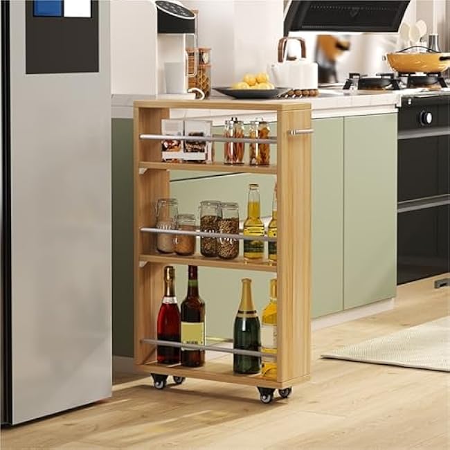 3-Tier Bar Cart, Beige Poly Rattan & Solid Acacia Wood, 39.8 x 15.7 x 39.4, Rolling Wheels, Mobile Serving Trolley for Kitchen, Outdoor Patio, Home Storage-rJmsae1U