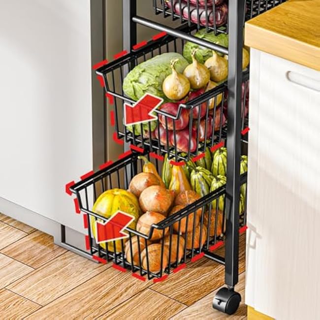 4 Tier Metal Utility Rolling Cart with Wood Top and Pull Out Baskets Kitchen Storage Organizer for Living Room Dining Room and Office