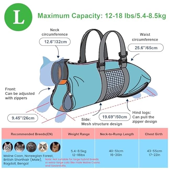 - Cat Grooming Bag with two rear zippers allow access to rear paws.If your cat’s weight is at the threshold between two sizes (e.g., 12-13 lbs), please choose size M to ensure a better fit.