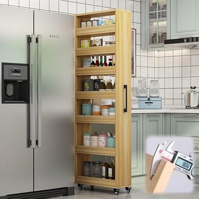 - Kitchen island storage cart with two slatted shelves and a pull-out drawer.