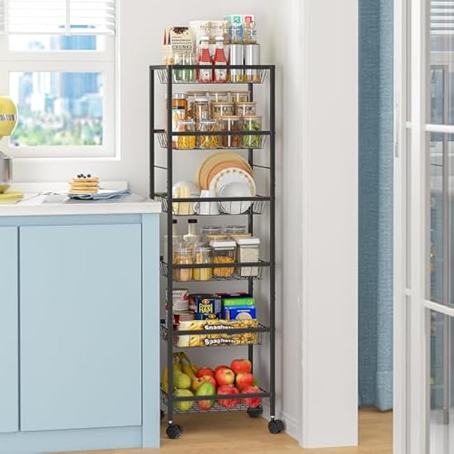 - Versatile Storage Cart£ºFeaturing a wood-look top layer and four drawer baskets, this 5-tier kitchen cart on wheels can serve multiple purposes, and be utilized as a kitchen organizer, fruit and vegetable basket, produce basket, toy storage bins, can dispensers, toiletries holder, pet supplies cart, or an office supplies organizer.
