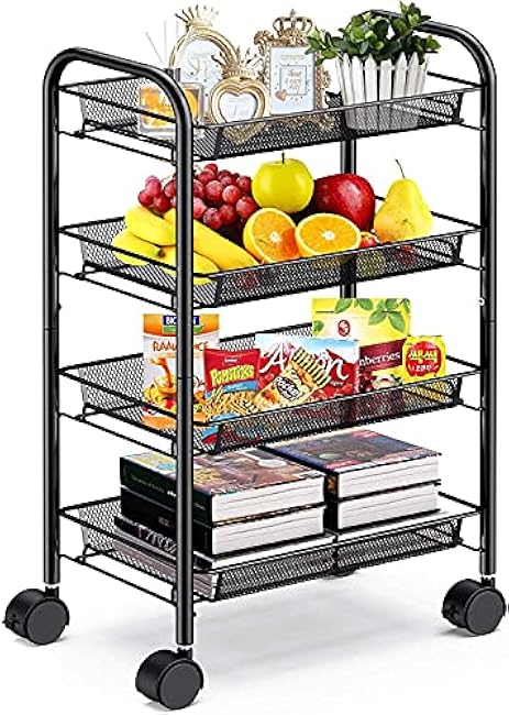 MOOACE Kitchen Cart on Wheels, 3-Tire Metal Mesh Rolling Utility Cart with Wood Cover, Multifunction Wire Basket Shelf Trolley for Home,Bathroom,Living Room(Black)-7QV6IOYs
