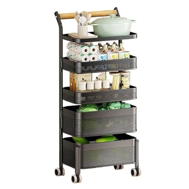 Multilayer Rolling Cart with Lockable Wheels, Metal Storage Baskets Trolley with Adjustable Height for Kitchen, Bedroom, or Living Room
