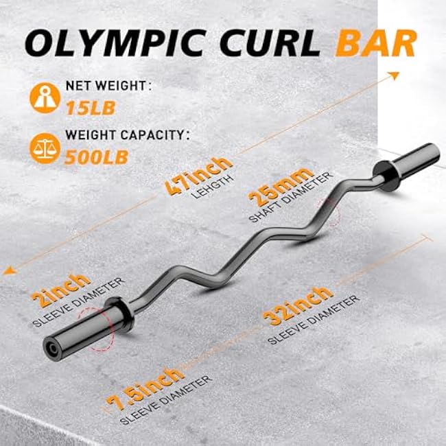 Olympic EZ Curl Barbell Bar 47, 2-Inch Curl Bar for Weight Lifting,Hip Thrusts,Squat,Biceps-Home Gym Weight Bar, Chrome Curling Bar for 2 Inch Weight Plates -2 Spring Collars(500lb Weight Capacity)
