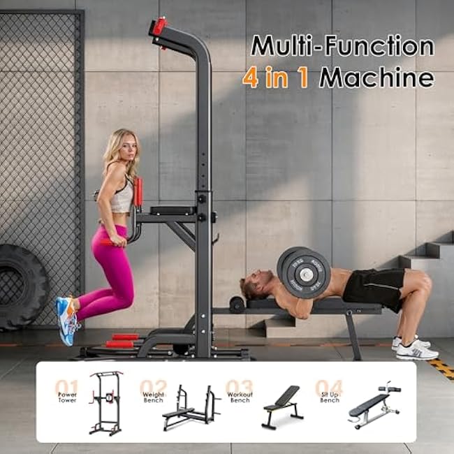 soges Pull Up Bar Dip Station, Power Tower with Folding Dumbbell Bench & Backrest, Adjustable Height Pull Up Bar Stand, Multi-Function Home Gym Strength Training Fitness Equipment 330LBS