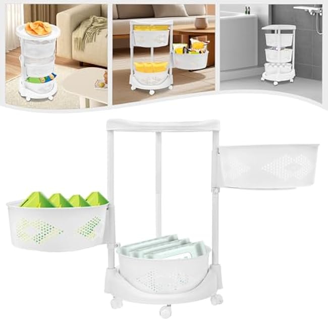 Vegetable Rack 3 Tier Rotating Kitchen Storage Rack Fruit Vegetable Storage Rack on Wheels, Storage Trolley Cart for Kitchen Household Corner Organisation
