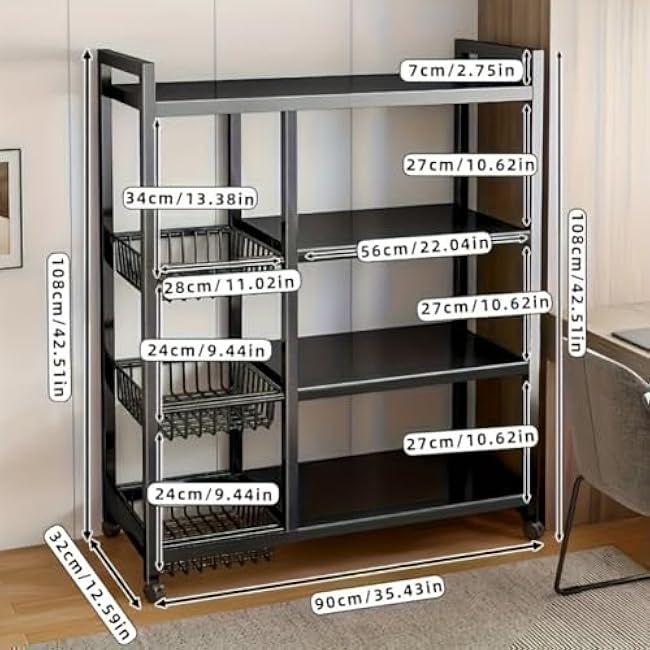 - Overall Size – 35.43 X 12.59 X 42.51. The small size makes this rolling cart perfect for narrow places to save your space, and it’s lightweight and easy to carry.